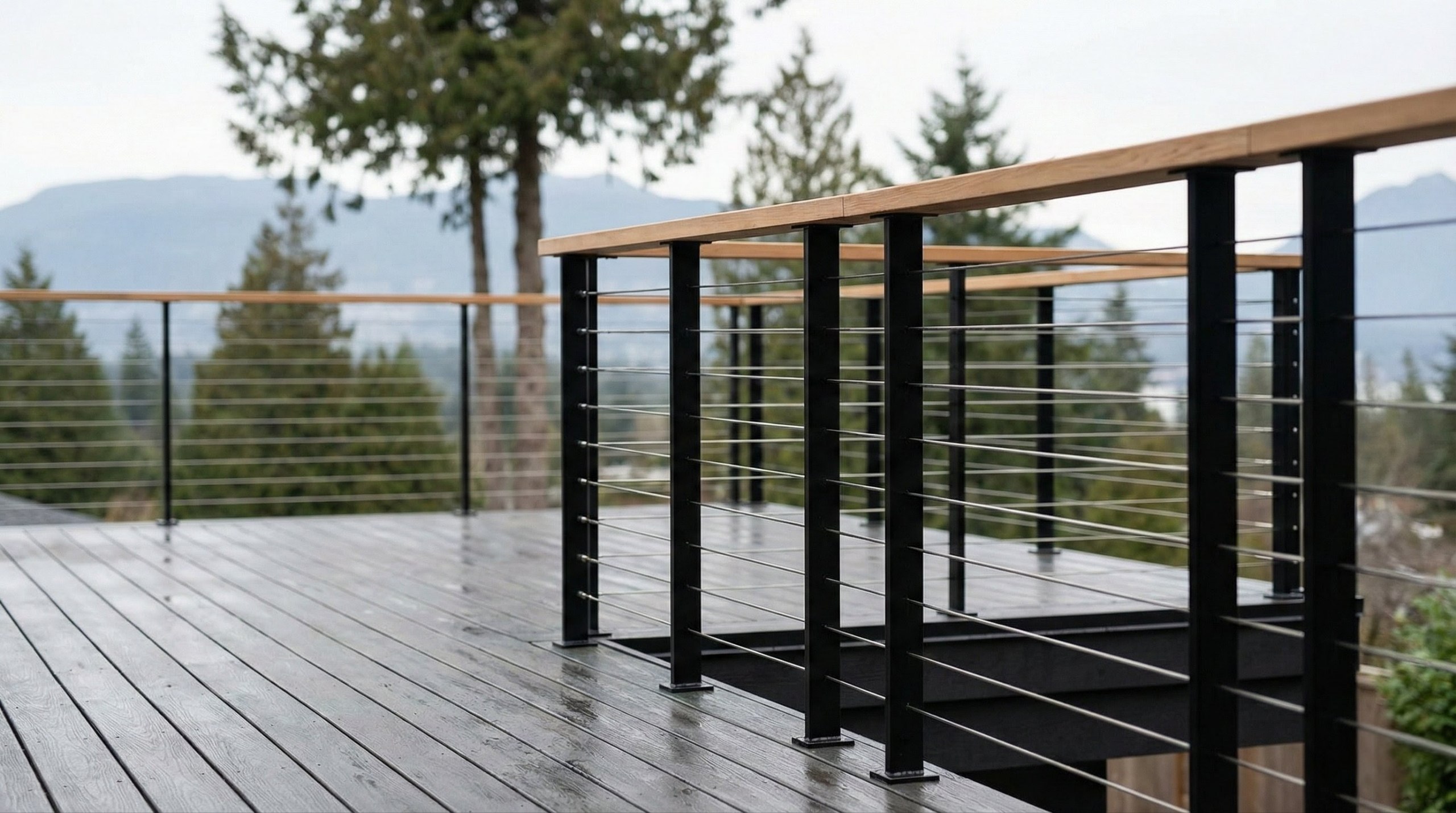 Stainless cable railing keeps the mountain views open for a cedar deck while meeting BC guard spacing. Powder-coated posts and coastal hardware hold up to North Shore rain and salt air.